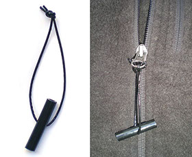 Darby cuffs were designed prior to mass production techniques and standardization. Spring tension and bolt diameter can vary even from the left cuff to the right cuff! This tool was designed to work even with these variances. It's compact (only 1.5" long) and discreet (disguised as a functioning zipper-pull toggle). Its unique design utilizes a special 375 lb. coated Kevlar® cord. Watch video below for instructions.